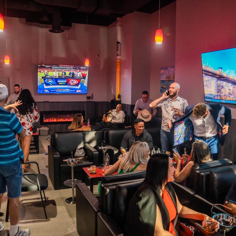 GallerySmok Cigar Lounge building exteriorOld Fashioned cocktail, top viewRoom with cigar shelvesShrimp Tempura, top viewFlatbread Pizza Buffalo CauliflowerInterior, seating areaMontecristo Triple Flame Cigar Stick Lighters in the boxChocolate dessertMeatballs served with marinaraCigar Lounge logo on the wallSeating area with guestsTrio of Meatball Sliders, side viewTobacco field with a tobacco barn in the backgroundThe owner with Karl MaloneThe owner with Governor Joe LombardoThe owner with his spouse and Raquel Quesada at an eventThe owner and Ernesto Perez CarilloThe owner with his family and Rafael NodalThe owner and his spouse posing for the shot on a tobacco fieldSmoke Cigar Lounge owner